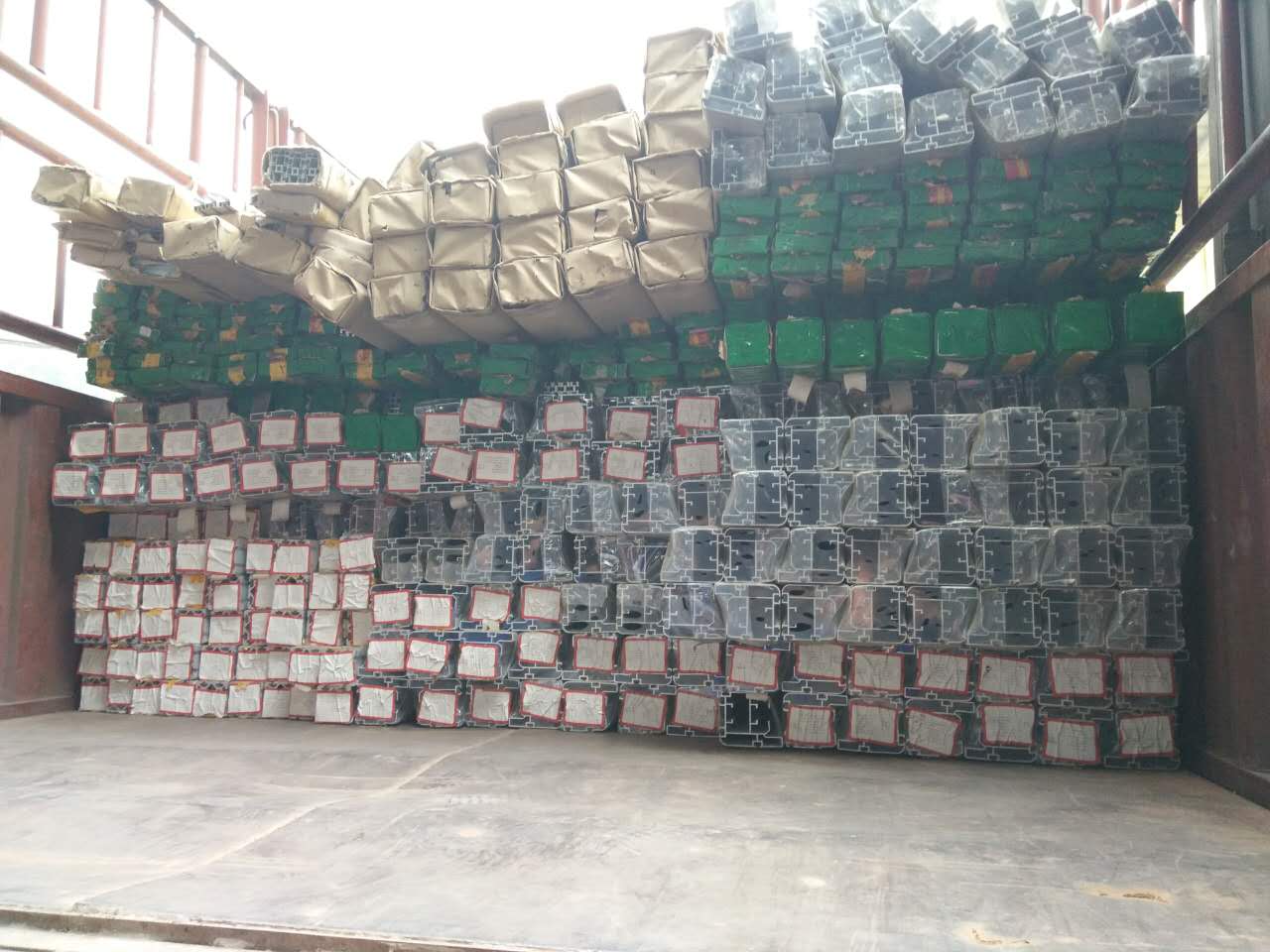 看,這一大堆鋁型材還等待著匯利興戰(zhàn)士們搬卸,在此感謝他們的付出,你們辛苦了?。。?br /> 一邊搬卸著鋁型材,一邊還要整齊擺放在庫(kù)位上。匯利興做事就是這么perfect?。。?br /> 又一大波倍速鏈鋁型材來襲,匯利興就是這么大氣、上檔次(二十噸鋁材,不是鬧著玩兒得)!??!