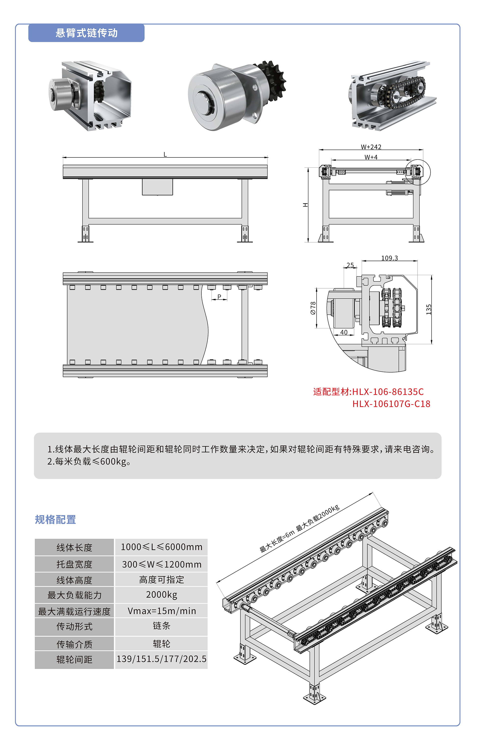 懸臂式鏈傳動(dòng):采用86135鋁型材,鏈輪傳動(dòng),鍍鉻滾輪鑲嵌銅套實(shí)現(xiàn)積放功能,負(fù)載2000kg/米,最大負(fù)載速度15M/min, 輪距139、151.5、177、202.5可選,適用托盤(pán)寬度300-1200mm,線(xiàn)體長(zhǎng)度范圍1000-6000mm, 高度根據(jù)需求定制