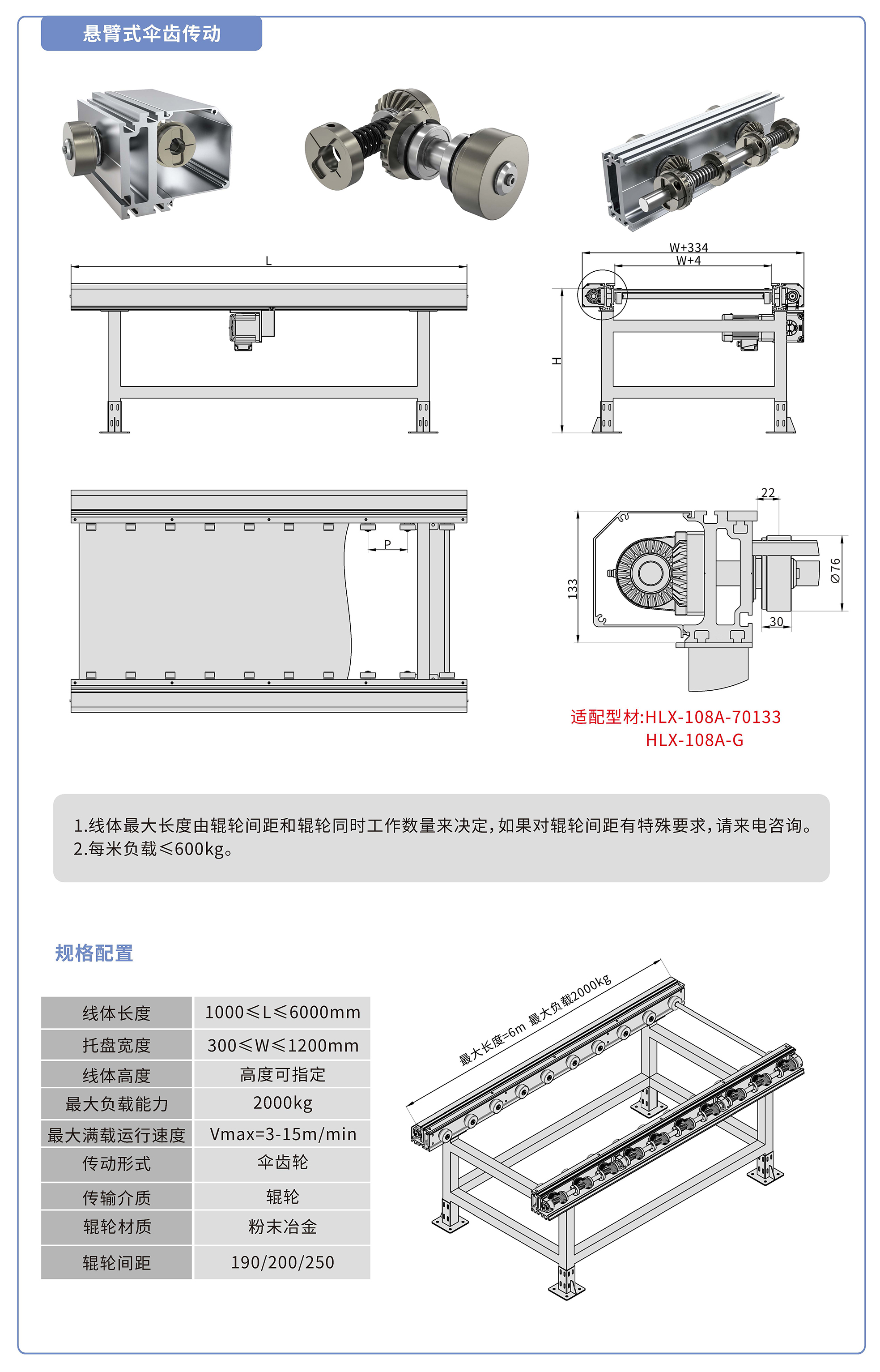 采用70133鋁型材,傘齒驅(qū)動(dòng),粉末冶金滾輪鑲嵌銅套實(shí)現(xiàn)積放功能,負(fù)載2000kg/米,最大負(fù)載速度15M/min, 輪距190、200、250可選,適用托盤(pán)寬度300-1200mm,線(xiàn)體長(zhǎng)度范圍1000-6000mm, 高度根據(jù)需求定制.